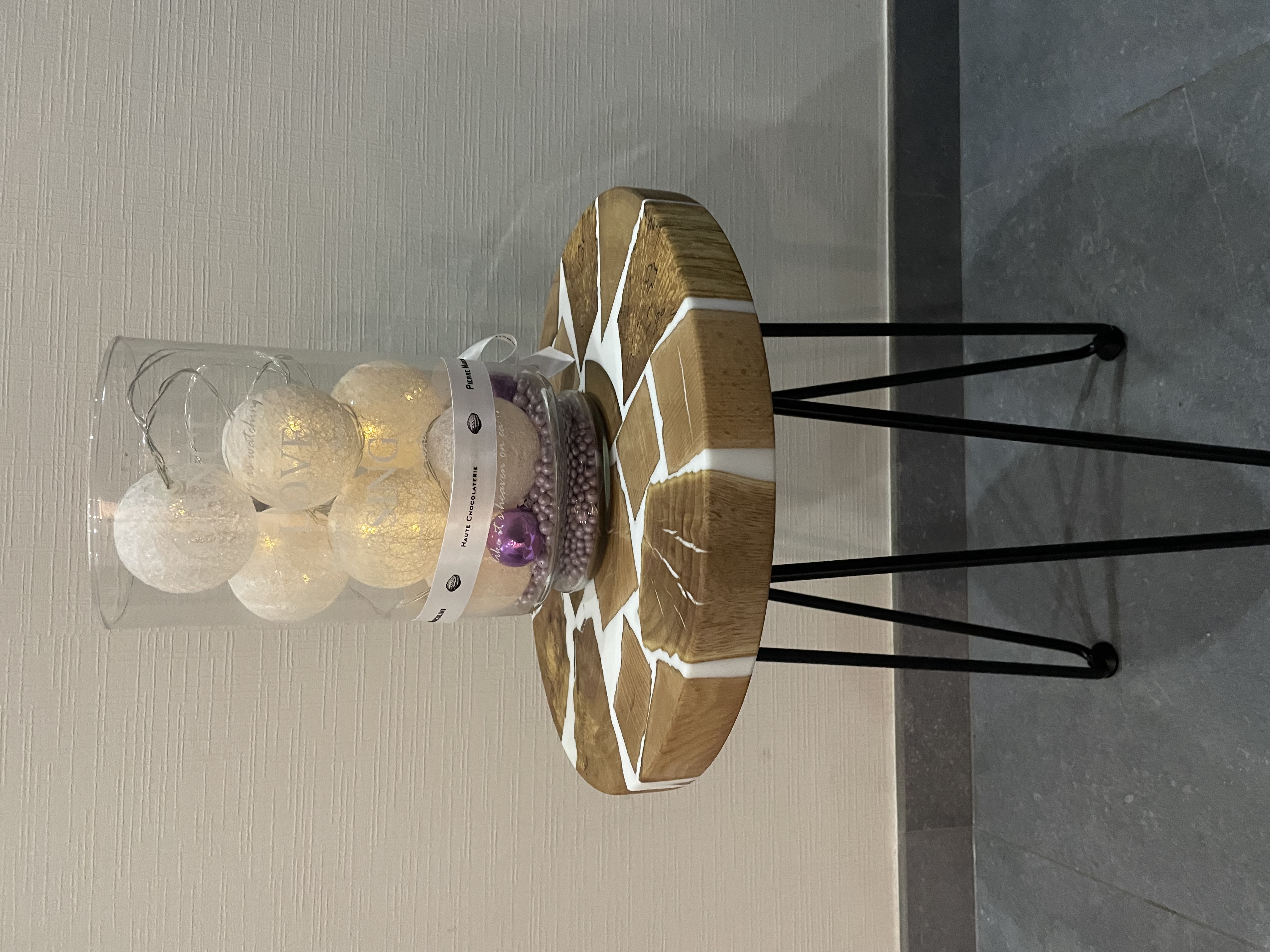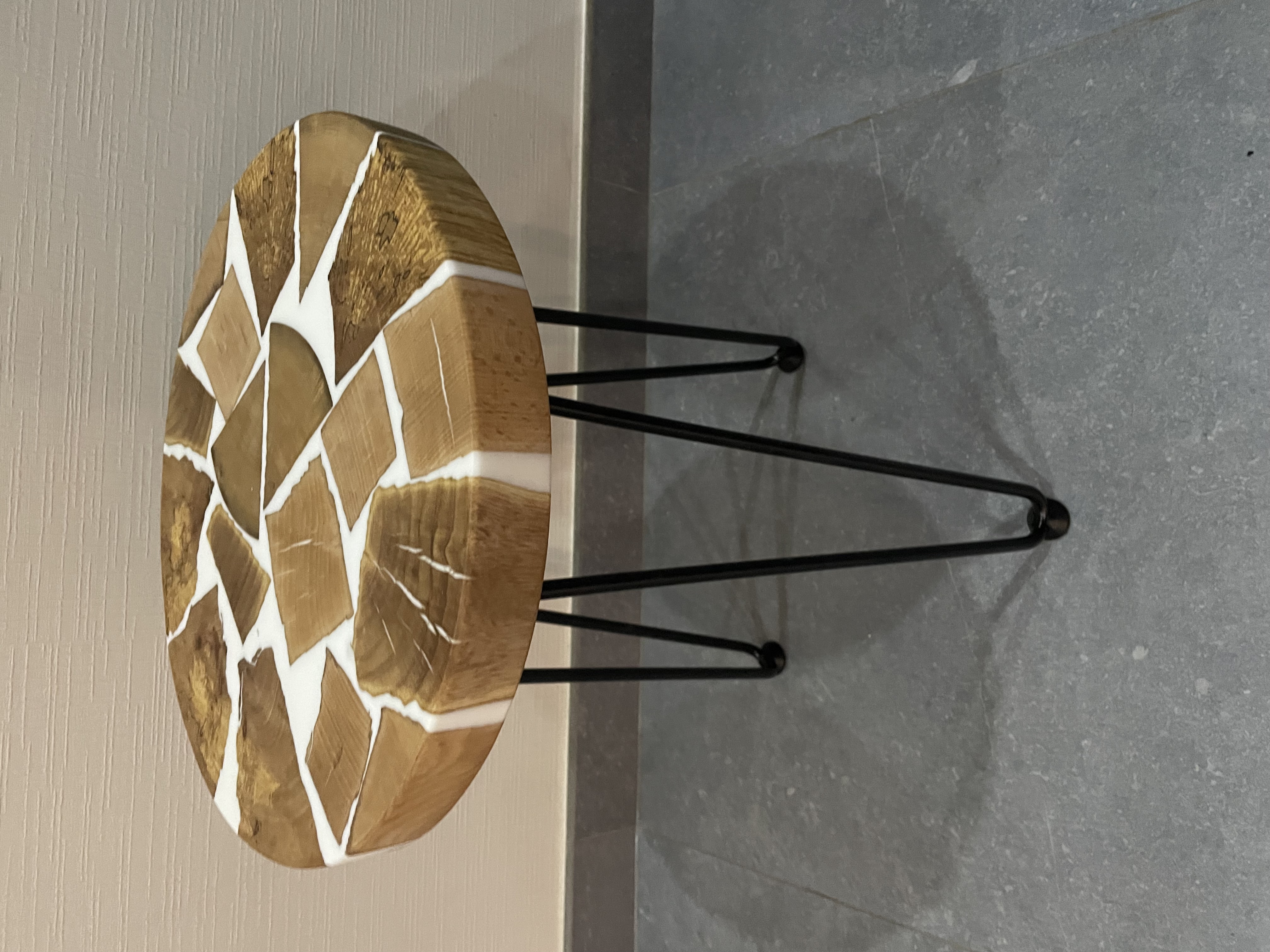 Réalisé en bois et résine blanche.